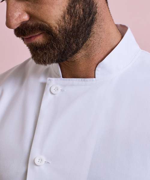 A durable short sleeve chef's jacket that fastens down the right hand side of the body with five long life resin buttons. On the left sleeve there is a handy double pocket pen compartment. This jacket is styled with a mandarin collar and is available in Black and White and offers great value for money.